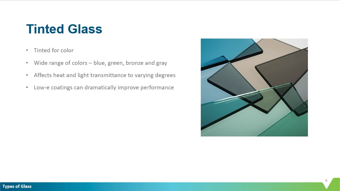 Created by incorporating a minor admixture into the glass during manufacturing, tinted glass provides neutral warm or cool-palette colors, such as blue, green bronze and gray. It also features a wide range of tints from light to medium to dark without affecting the basic properties of the glass, though they do affect heat and light transmittance to varying degrees. In addition, tinted glass can be laminated, tempered or heat-strengthened to satisfy strength or safety requirement. Much like clear glass, the color and performance of tinted glass varies by manufacturer because no ASTM color or performance specification for tinted glass exists.