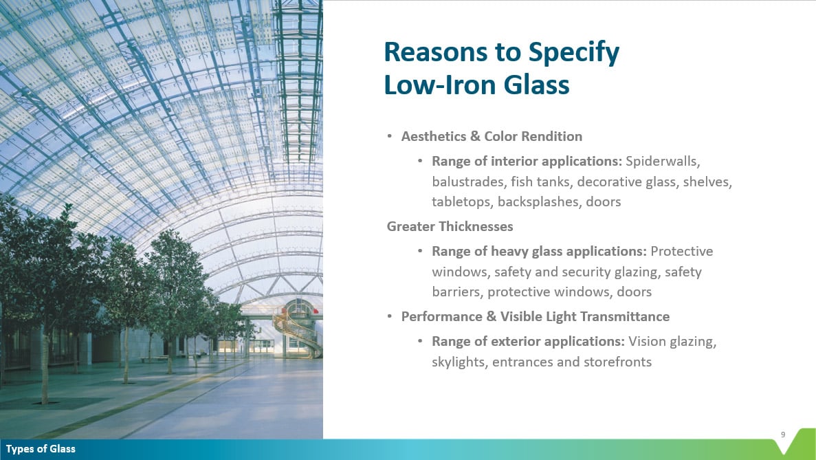 Low-iron glass is ideal for safety and security glazing, safety barriers, protective windows and doors. Low-iron glass also is specified for interior elements such as spiderwalls, balustrades, fish tanks, decorative glass, shelves, tabletops, backsplashes and doors. Exterior applications include vision glazing, skylights, entrances and storefronts.